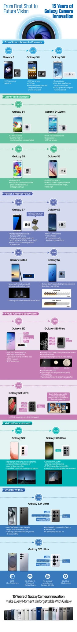 Με το Galaxy S9 παρουσιάστηκε το Dual Aperture, προσφέροντας μηχανική εναλλαγή ανάμεσα σε δύο διαφράγματα. Στη συνέχεια, το Galaxy S10 καθόρισε τη δημοφιλή διάταξη φακών, με την προσθήκη του υπερευρυγώνιου φακού, καθώς και λειτουργίες όπως η Super Steady για σταθεροποίηση βίντεο. Το Galaxy S20 Ultra τάραξε τα νερά με τον αισθητήρα 108MP και τη δυνατότητα εγγραφής βίντεο σε 8K.