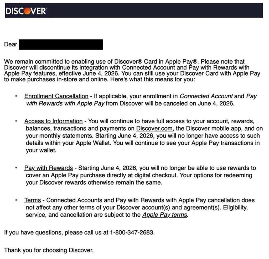 Σε μια ειδοποίηση που εστάλη στους κατόχους καρτών, η Discover αναφέρει ότι σύντομα θα διακόψει την υποστήριξη για την ενσωμάτωση του Συνδεδεμένου Λογαριασμού της, καθώς και για τη λειτουργία Pay with Rewards στο Apple Pay.