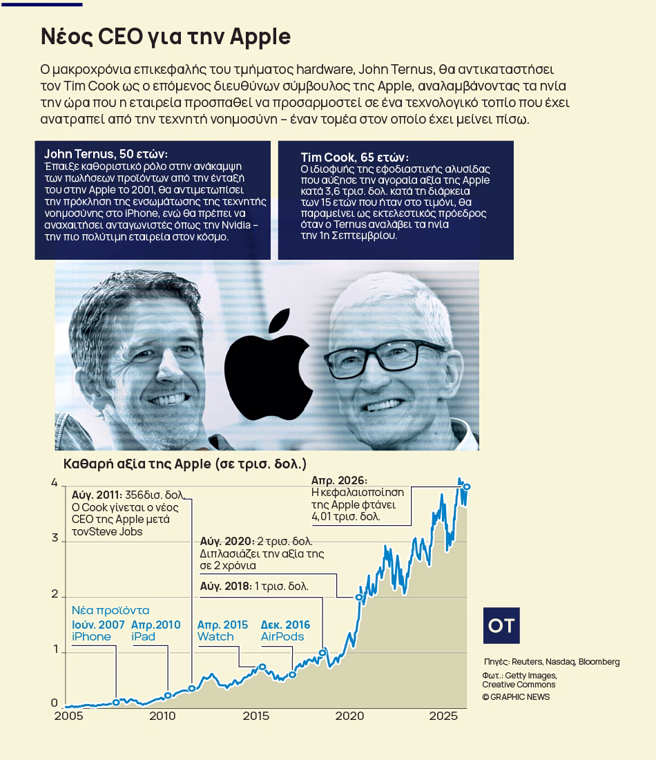 Η αλλαγή ηγεσίας έρχεται σε μια κρίσιμη στιγμή για την εταιρεία. Μετά από χρόνια στην κορυφή των παγκόσμιων κατατάξεων, η Apple έχει πρόσφατα ξεπεραστεί σε χρηματιστηριακή αξία από την κατασκευάστρια τσιπ AI Nvidia, καθώς οι επενδυτές αμφισβητούν τον ρυθμό καινοτομίας της σε μια ταχέως μεταβαλλόμενη εποχή τεχνητής νοημοσύνης.