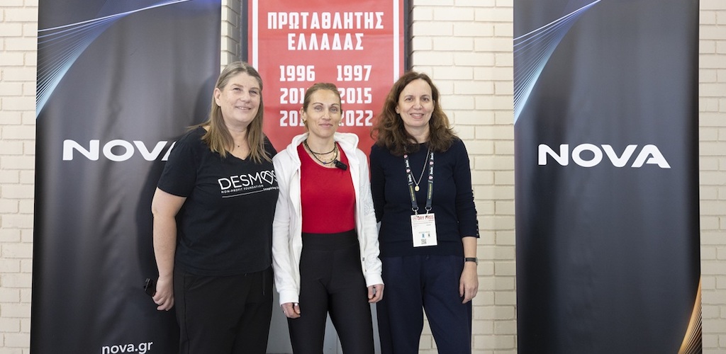 Λεζάντα: Από αριστερά προς τα δεξιά: Έμιλυ Κέρν, Γενική Διευθύντρια του Δεσμού, Πένη Γιοβάνοβιτς, Project Experience & CSR Manager της ΚΑΕ Ολυμπιακός, Μάρθα Κεσίσογλου, Corporate Affairs Executive Director της Nova