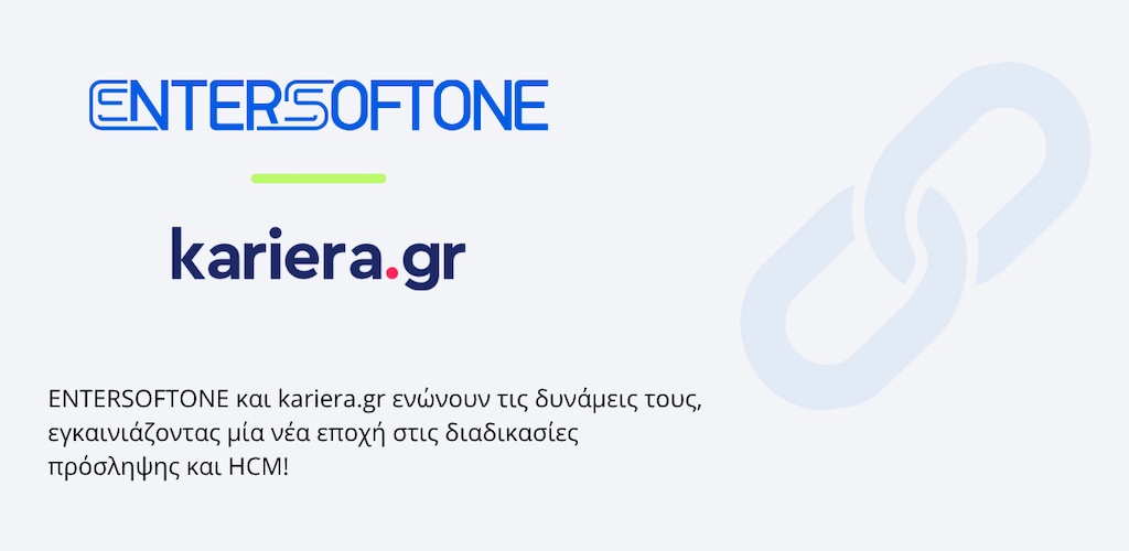 Η ENTERSOFTONE και το kariera.gr ανακοινώνουν την έναρξη στρατηγικής συνεργασίας, αντανακλώντας την κοινή τους δέσμευση για την ανάληψη δράσεων και πρωτοβουλιών που προάγουν τη διαμόρφωση ενός πιο συγχρόνου και αποδοτικού μοντέλου λειτουργίας σε όλο το φάσμα της διαχείρισης ανθρώπινου δυναμικού και επιταχύνουν έμπρακτα τον ψηφιακό μετασχηματισμό της λειτουργίας HR.