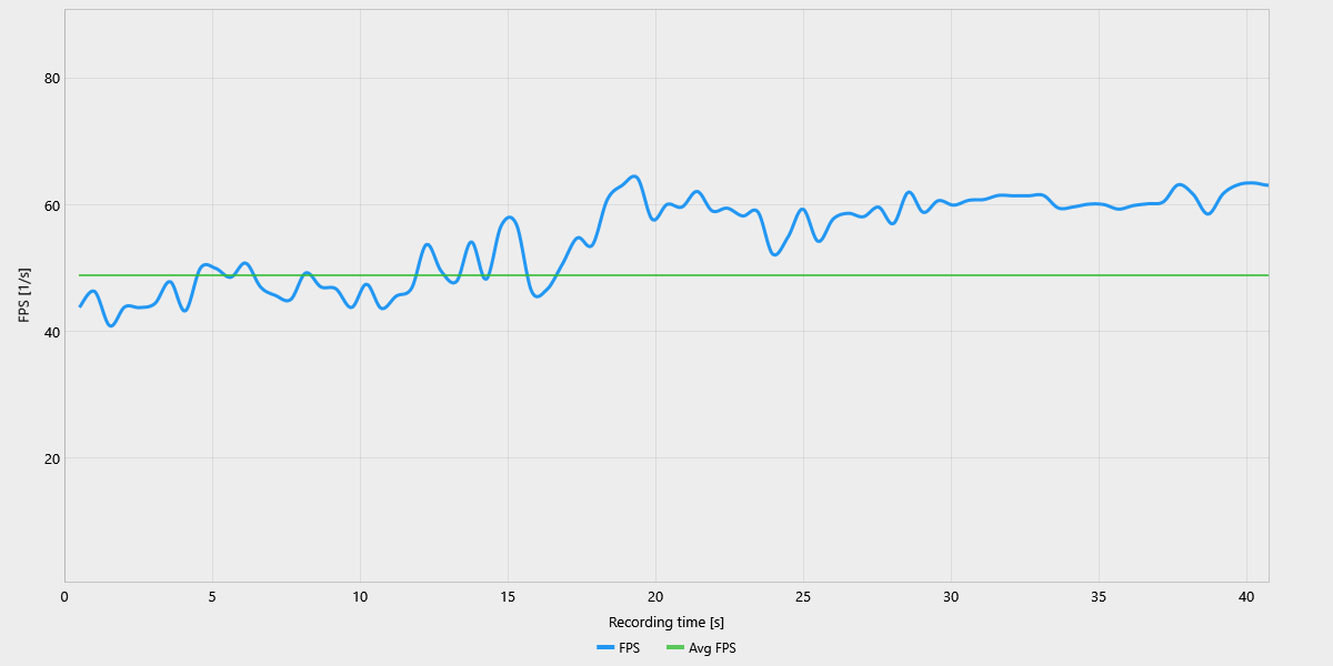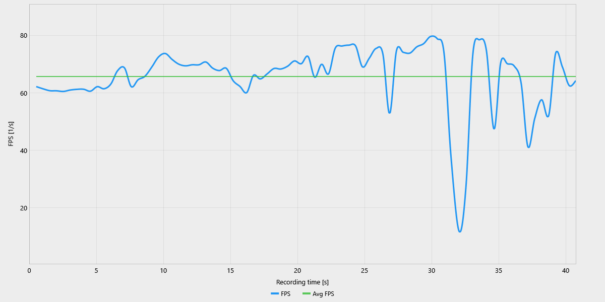 Το παιχνίδι μερικές φορές τρέχει κοντά στο όριο της προσωρινής μνήμης των 8 GB VRAM, αλλά στις δοκιμές μου, δεν το ξεπέρασε ποτέ ή δεν παρουσίασε υφή ή αναδυόμενο. Μέσω του CapFrameX, η μέγιστη χρήση GPU VRAM που αναφέρθηκε ήταν 7,67 GB, κάτι που ίσως υποδηλώνει ότι το παιχνίδι μόλις χωράει στην προσωρινή μνήμη VRAM. Οι περιοδικές πτώσεις στο γράφημα FPS που μπορείτε να δείτε παρακάτω δεν αντιστοιχούν με το παιχνίδι που γεμίζει VRAM, διαχέεται στη μνήμη και ξεπλένει το VRAM, καθώς η ίδια συμπεριφορά επιδεικνύεται με την ποιότητα υφής μέχρι τη μέση. Μάλλον, είναι ένα καλά τεκμηριωμένο φαινόμενο με το DX12 σε ορισμένες περιοχές του παιχνιδιού.