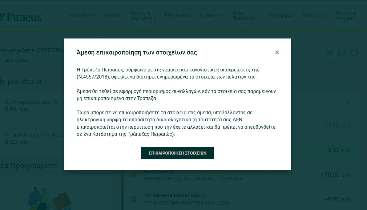 Η επικαιροποίηση στοιχείων στις τράπεζες είναι υποχρεωτική για όλους και απαραίτητη, καθώς χωρίς αυτή, θα υπάρξουν περιορισμοί στις συναλλαγές. Το μήνυμα που μας εμφανίζει η Πειραιώς: