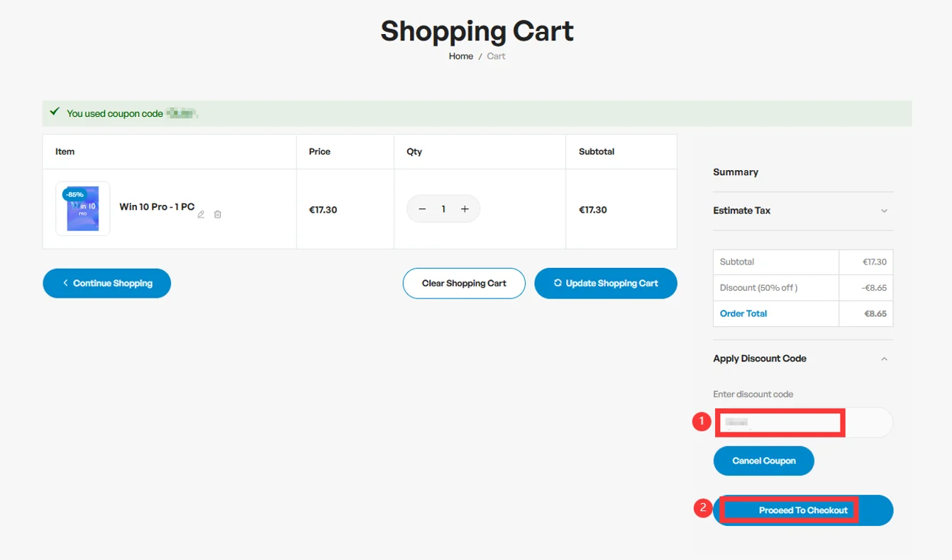 Προσθέστε το προϊόν στο καλάθι αγορών, συμπληρώστε τον κωδικό κουπονιού και, αφού επιβεβαιώσετε, πατήστε «Proceed To Checkout».