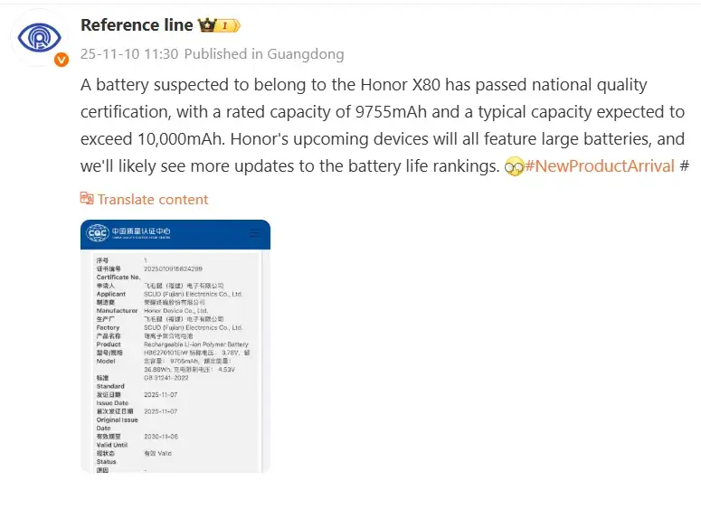 Ο Honor X70που κυκλοφόρησε τον Ιούλιο του 2025, ήδη ξεχώρισε με 8.300 mAh η μπαταρία του και το διπλό Ενσύρματη και ασύρματη φόρτιση 80W. Το νέο Χ80 φαίνεται ότι το παιχνίδι θα πάει ένα βήμα παραπέρα: ο πιστοποιημένο συσσωρευτή που εντοπίστηκε στους Κινέζους 3C έχει ονομαστική χωρητικότητα 9.755 mAhπράγμα που σημαίνει ότι το εμπορικό «τυπικό» μέγεθός του θα ξεπεράσει το 10.000 mAh.