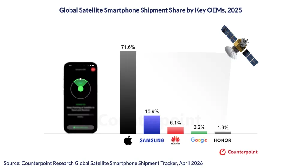 Η Counterpoint λέει ότι η αγορά αυτή τη στιγμή είναι διχασμένη, με εταιρείες όπως η Apple, η Huawei και η Google να χρησιμοποιούν ιδιόκτητα δορυφορικά συστήματα, ενώ μεγάλο μέρος του οικοσυστήματος Android, συμπεριλαμβανομένων των Samsung, Xiaomi, OPPO, HONOR και vivo, ευθυγραμμίζεται με τα αναδυόμενα πρότυπα μη επίγειων δικτύων 3GPP (NTN).