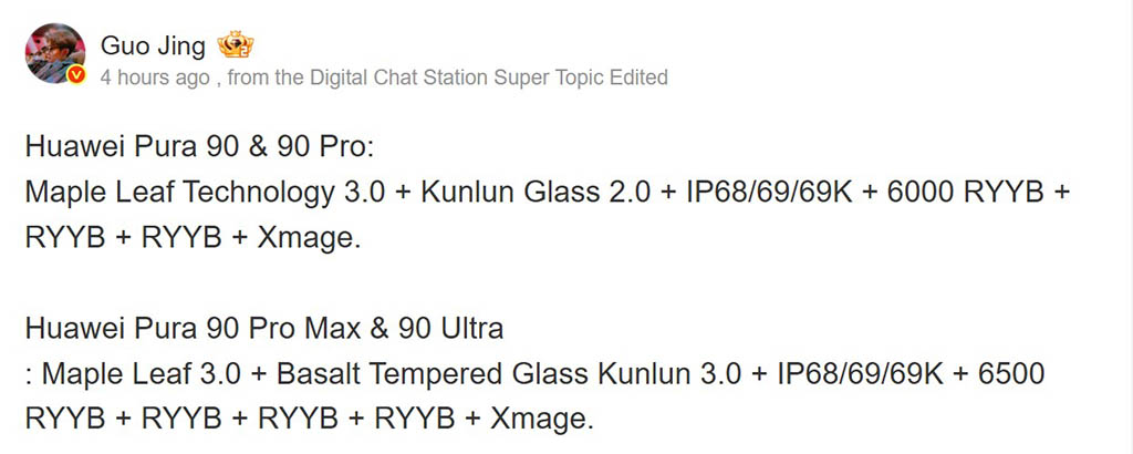 Ο Guo αποκάλυψε ότι και τα τέσσερα μοντέλα της σειράς Pura 90 θα διαθέτουν τεχνολογία Red Maple 3ης γενιάς (Multispectral 3.0). Αν είναι αλήθεια, οι επερχόμενες συσκευές Pura θα ανοίξουν νέες πόρτες φωτογραφίας με φωτεινότερες αλλά και πλουσιότερες χρωματικές έννοιες.
