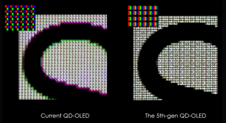 Η δεύτερη ενημέρωση είναι το πάνελ QD-OLED 5ης γενιάς της Samsung, το οποίο συνοδεύεται από μια νέα δομή εικονοστοιχείων V-Stripe που βελτιώνει τη σαφήνεια των άκρων του κειμένου, καθιστώντας το ιδανικό για χρήστες που ασχολούνται με εργασίες με ένταση κειμένου, όπως επεξεργασία εγγράφων, κωδικοποίηση ή δημιουργία περιεχομένου. Η MSI έδωσε μια πιο προσεκτική ματιά στη διάταξη των pixel όπως φαίνεται παρακάτω: