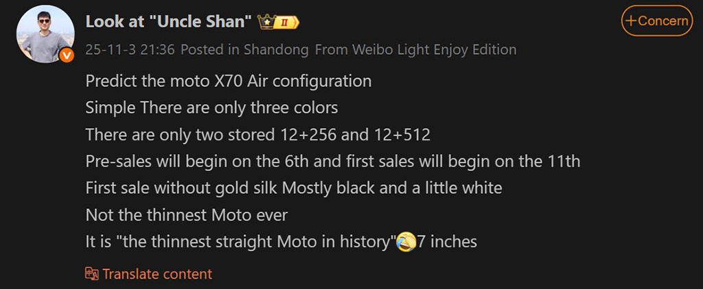 Ο UncleKanshan μοιράστηκε ορισμένες λεπτομέρειες στο Weibo που σχετίζονται με το ακουστικό της Air. Ο tipster έχει προβλέψει την εσωτερική διαμόρφωση του Moto X70 Air. Αλλά ορισμένοι χρήστες του Διαδικτύου υπέθεσαν ότι δεν είναι το Moto αλλά το επερχόμενο εξαιρετικά λεπτό τηλέφωνο Mate.