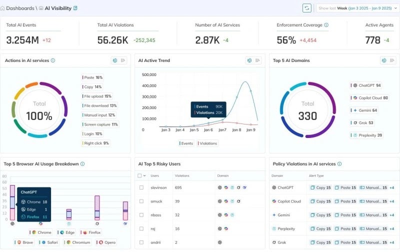 - Πλήρης ορατότητα δραστηριότητας AI: Παρακολούθηση σε πραγματικό χρόνο όλων των αλληλεπιδράσεων τεχνητής νοημοσύνης, συμπεριλαμβανομένων των μηνυμάτων, των μεταφορτώσεων, των λήψεων και της συμπεριφοράς πρακτόρων.