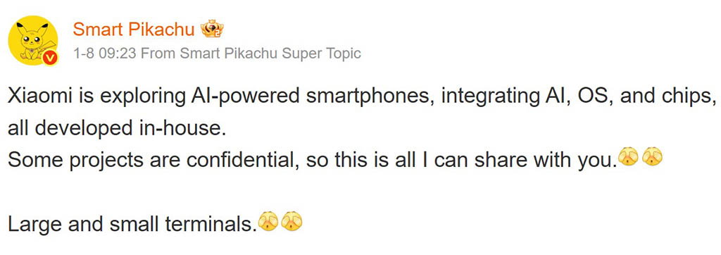 Ο SmartPikachu σημείωσε ότι η Xiaomi στοχεύει σε ένα νέο smartphone που θα βασίζεται στο δικό της λειτουργικό σύστημα, AI και τεχνολογία chip. Σημειώστε ότι όλα αυτά τα βασικά στοιχεία θα ανήκουν στην Xiaomi και όχι σε οποιαδήποτε άλλη ξένη εταιρεία ή τεχνολογικές δυνατότητες των ΗΠΑ.