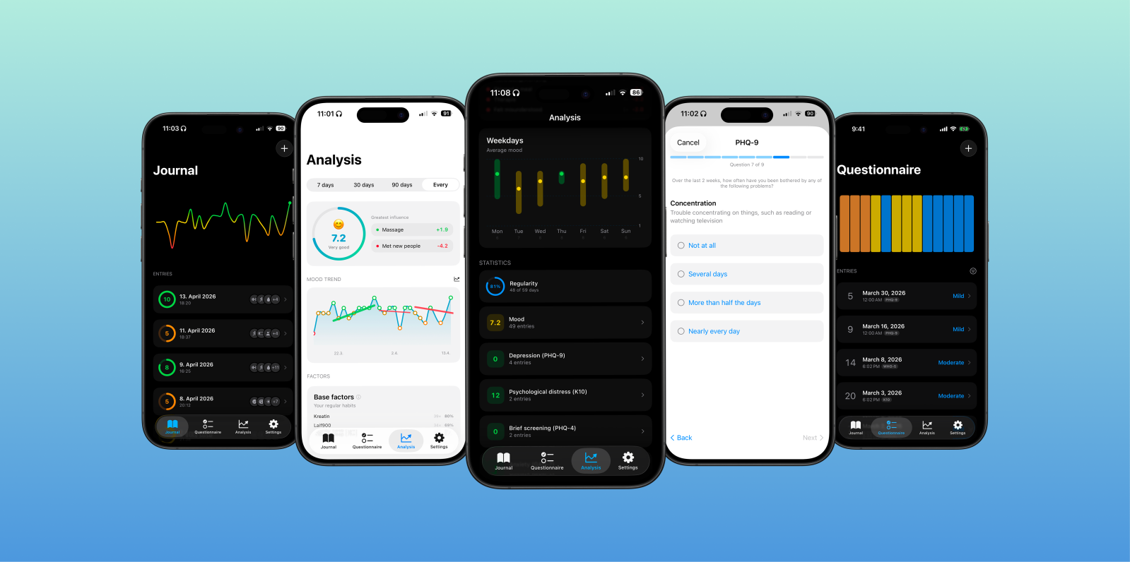 Πέρα από την καθημερινή σας διάθεση, InnerPulse υποστηρίζει επίσης ερωτηματολόγια σε βάθος εάν αντιμετωπίζετε άγχος ή κατάθλιψη, συμπεριλαμβανομένων των ερευνών PHQ-9, GAD-7, K10 και PHQ-4. Αυτά είναι απλώς προληπτικά, επομένως δεν είναι οριστικά, αλλά σας βοηθούν να παρακολουθείτε τον εαυτό σας.