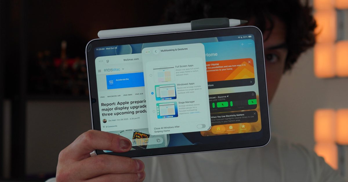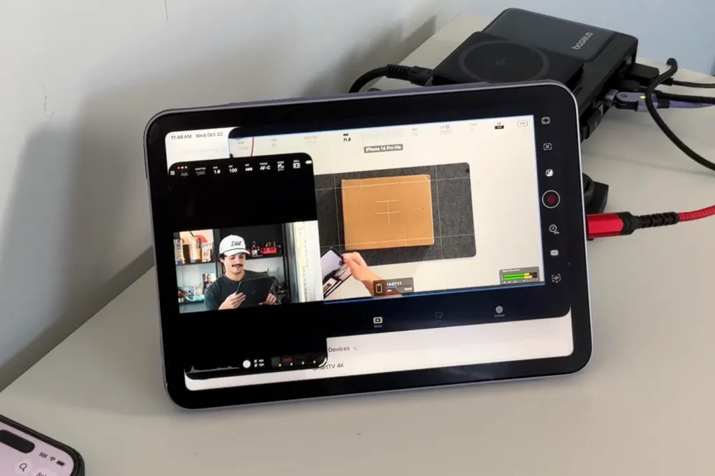 Υπάρχουν πολλοί τρόποι για να χρησιμοποιήσετε το iPad mini σε μια ρύθμιση παραγωγικότητας. Μπορείτε να το χρησιμοποιήσετε για να κρατάτε σημειώσεις με το Apple Pencil Pro. Μπορείτε να επεξεργαστείτε φωτογραφίες στο Lightroom ή στο Affinity Photo. Μπορείτε να επεξεργαστείτε podcast όπως κάνει ο καλός μου φίλος Stephen Robles. Αλλά το χρησιμοποιώ ως κεντρικό διανομέα οθόνης όταν κάνω εγγραφή. Μπορώ ταυτόχρονα να χρησιμοποιήσω το iPad ως σκόπευτρο για το Sony a6100 μου χρησιμοποιώντας την εφαρμογή monitor+, στη συνέχεια να έχω επίσης μια τροφοδοσία βίντεο από το iPhone μου χρησιμοποιώντας την εφαρμογή Blackmagic Camera και, τέλος, να μεταφέρω ήχο στην εφαρμογή Voice Memos από το μικρόφωνο Shure SM7. Όλα αυτά έγιναν στο iPad mini με το νέο σύστημα παραθύρων του iPadOS 26.