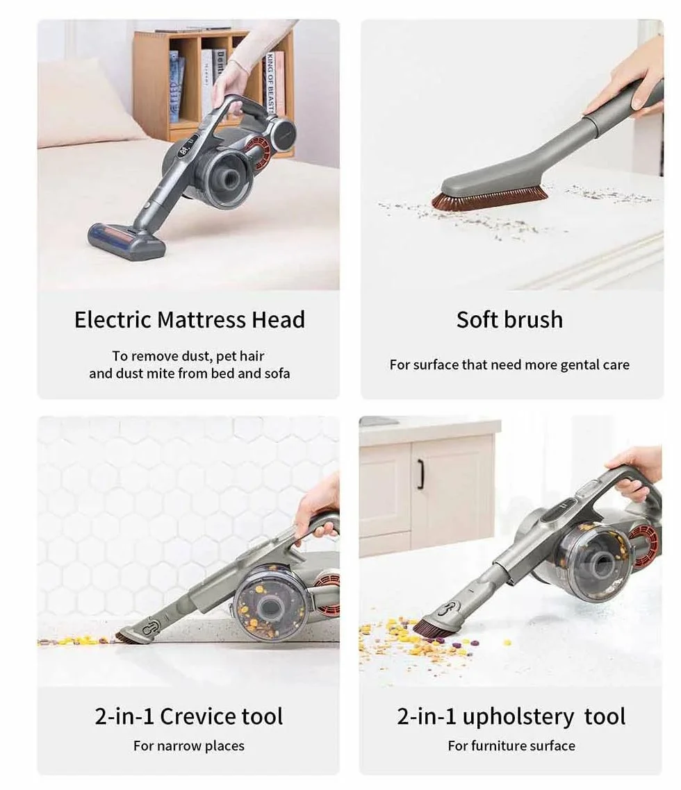 Φυσικά, εκτός απο τη βασική βούρτσα, θα βρείτε 4 ακόμα κεφαλές. Μια για ακάρεα για χρήση σε στρώματα και καναπέδες, μια για γωνίες, μια για επιφάνειες, και μια με μακρόστενη μαλακή βούρτσα, για ευαίσθητες επιφάνειες.