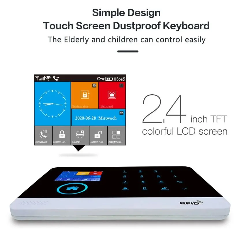 Το κεντρικό Panel του συναγερμού, έχει μια οθόνη 2.4″, για τις βασικές ενδείξεις, και ένα numeric touchpad για να το ελέγχετε.