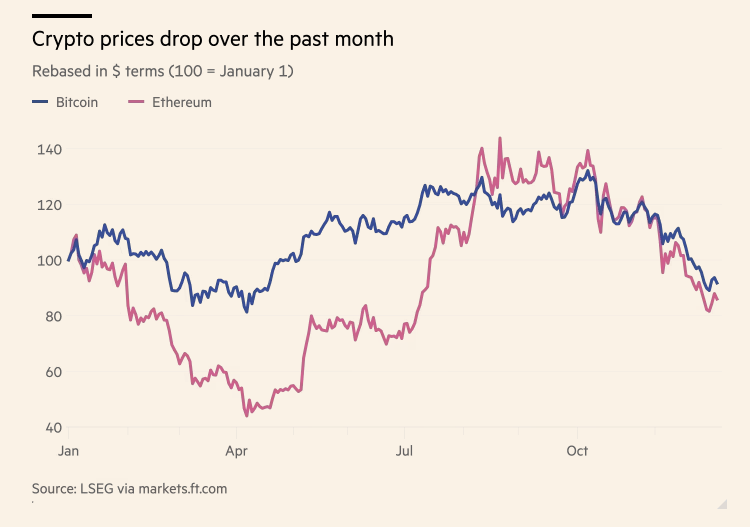 Ωστόσο, η τρέλα έχει ξεθυμάνει, καθώς τα κρυπτονομίσματα υπέστησαν το μεγαλύτερο πλήγμα από την πώληση κερδοσκοπικών περιουσιακών στοιχείων αυτό το φθινόπωρο, σε μια απότομη ανατροπή για έναν τομέα που είχε ενισχυθεί από την υπόσχεση του Προέδρου Ντόναλντ πέρυσι να μετατρέψει τις σε «υπερδύναμη του Bitcoin».