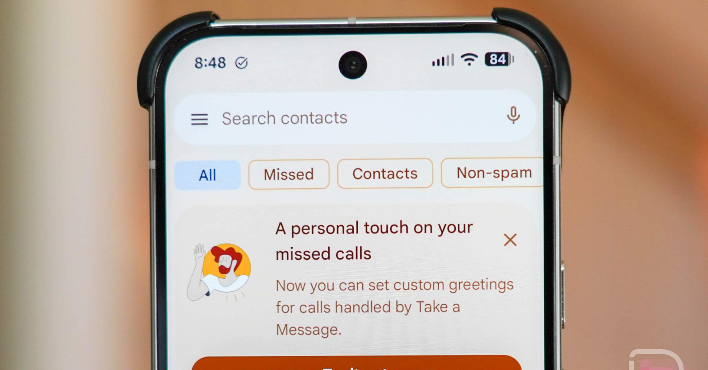 Μόλις ενημερώσετε την εφαρμογή σας, ανοίξτε την και θα παρατηρήσετε μια ειδοποίηση στο επάνω μέρος που αναφέρει, “Μια προσωπική πινελιά στις αναπάντητες κλήσεις σας”. Αυτή η ειδοποίηση επισημαίνει ότι μπορείτε πλέον να ορίσετε προσαρμοσμένους χαιρετισμούς για τις κλήσεις που διαχειρίζεται η λειτουργία “Take a Message”.