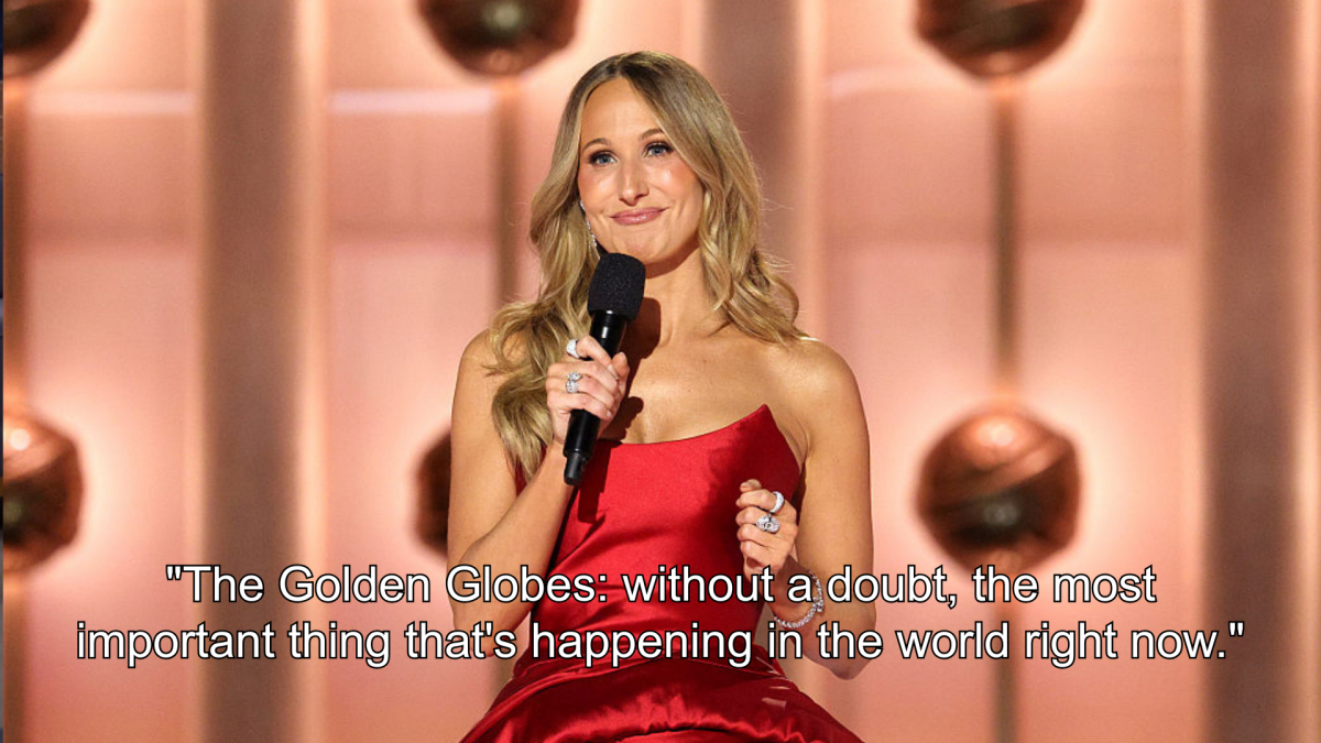 Ο παρουσιαστής των Χρυσών Σφαίρων, Nikki Glaser, ξεκίνησε την τελετή απονομής των βραβείων με έναν μονόλογο με επίγνωση του εαυτού του απόψε, κουνώντας καταφατικά τα τρέχοντα ειδησεογραφικά γεγονότα που αποσπούν σχεδόν όλους.