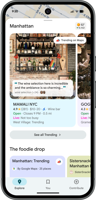 Όσον αφορά την ενημερωμένη καρτέλα Εξερεύνηση, η Google διευκόλυνε και γρηγορότερα την εύρεση δημοφιλών σημείων κοντά σας. Οι χρήστες μπορούν τώρα να σύρουν προς τα επάνω για να δουν μοντέρνα και δημοφιλή εστιατόρια, δραστηριότητες και αξιοθέατα σε κοντινή απόσταση, όπως ένα νέο καφέ που μόλις άνοιξε ή μια περίεργη γκαλερί τέχνης στη γωνία.
