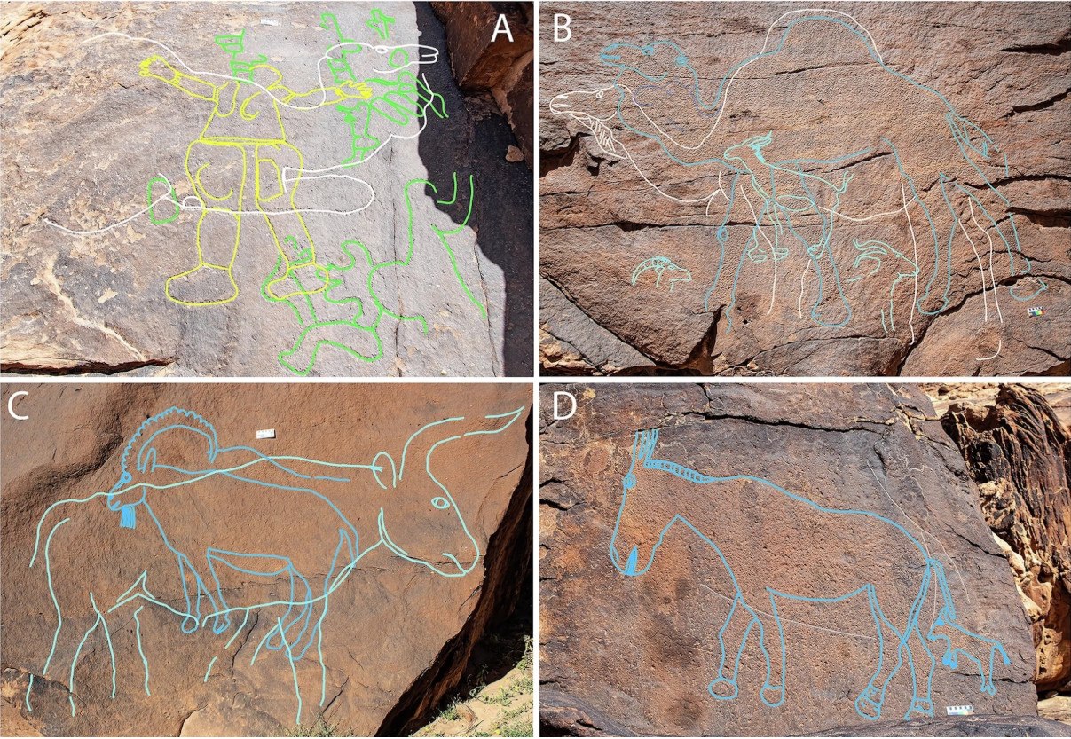 Οι χαράξεις απεικονίζουν κυρίως καμήλες, αίγαγρους, γαζέλες και ιπποειδή, ενώ εντοπίστηκε και μία μοναδική παράσταση εξαφανισμένου προγόνου βοοειδούς. Ορισμένες φιγούρες ανθρώπων συνοδεύουν τα ζώα, σε συνθέσεις που δείχνουν καλλιτεχνική εξέλιξη: νεότερα έργα επικαλύπτουν παλαιότερα, πιο σχηματικά σχέδια.