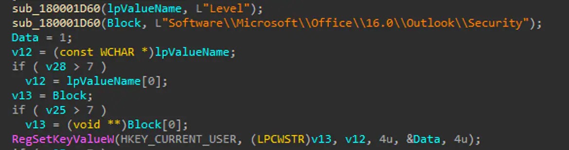 Το κακόβουλο λογισμικό αλλάζει τις ρυθμίσεις για να φορτώσει αυτόματα την κακόβουλη μακροεντολή κατά την εκκίνηση (LoadMacroProviderOnBoot) και μειώνει το επίπεδο ασφάλειας μακροεντολών του Outlook για να επιτρέψει σε όλες τις μακροεντολές να εκτελούνται, καταστέλλοντας τα παράθυρα διαλόγου ασφαλείας.