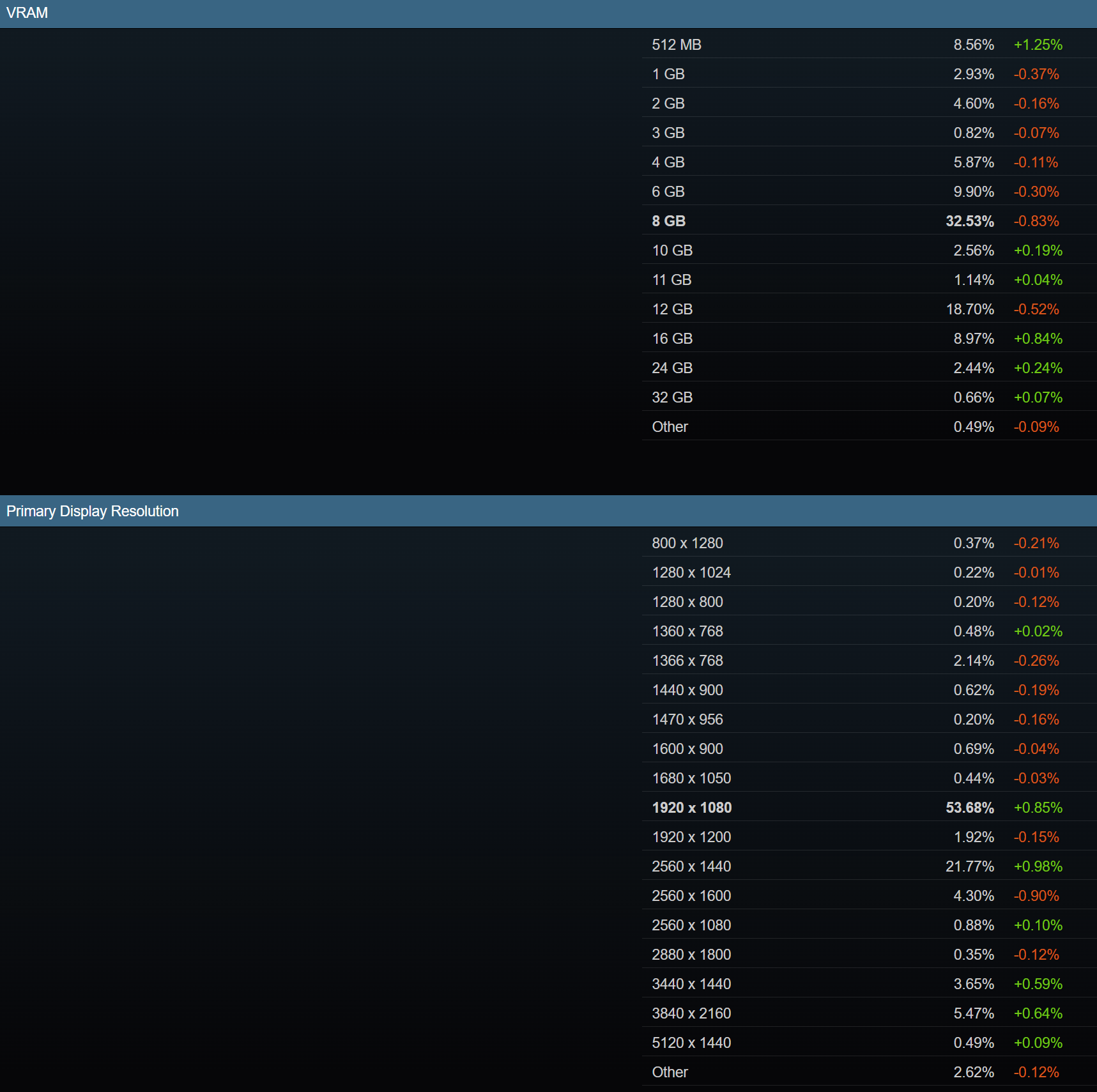 Τέλος, όσον αφορά την ανάλυση, φαίνεται ότι το 1080p παρέμεινε η πιο δημοφιλής επιλογή με μερίδιο 53,68%, αλλά τα 1440p κερδίζουν δυναμική και βλέπουμε επίσης μια καλή εισροή μετοχών για 2160p. Το 1440p κατέχει μερίδιο 21,77% ενώ το 4K κατέχει μερίδιο 0,64%. Το UWQHD (3440×1440) έχει επίσης ελαφρά άνοδο στο 3,65%, αλλά φαίνεται ότι περισσότεροι παίκτες θέλουν υψηλότερους ρυθμούς ανανέωσης σε οθόνη 1440p ή 1080p, ενώ το 4K απαιτεί περισσότερη ιπποδύναμη GPU και με την τιμολόγηση των high-end GPUs να είναι πλέον απρόσιτη για τους περισσότερους παίκτες που χρειάζονται GPU και RAM μείνετε σε αναλύσεις 1080p & 1440p.