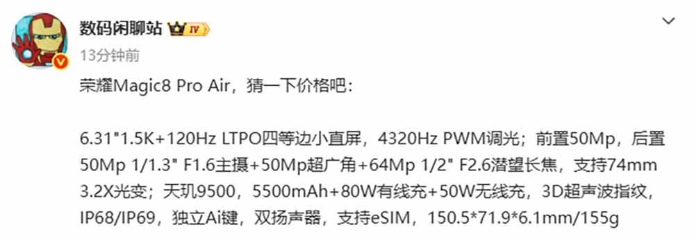 Προδιαγραφές Honor Magic 8 Pro Air (Πηγή – DigitalChatStation)