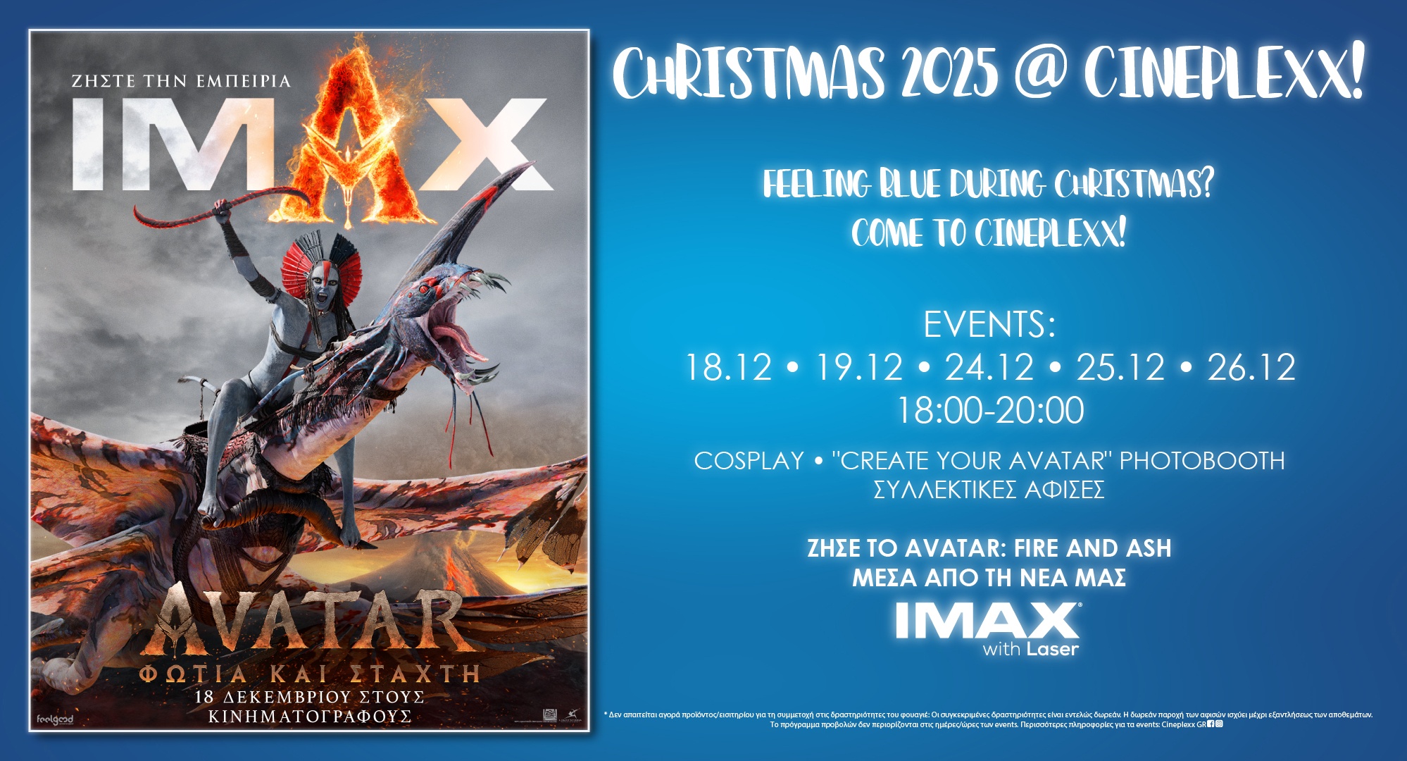 Ανακάλυψε την μαγεία του “Avatar: Fire and Ash” στην νέα IMAX WITH LASER του Πολυκινηματογράφου CINEPLEXX! Μη χάσεις την ευκαιρία να βιώσεις τη μοναδική εμπειρία θέασης που προσφέρει η τεχνολογία IMAX με λέιζερ, καθιστώντας την ταινία ακόμα πιο εντυπωσιακή.