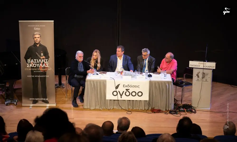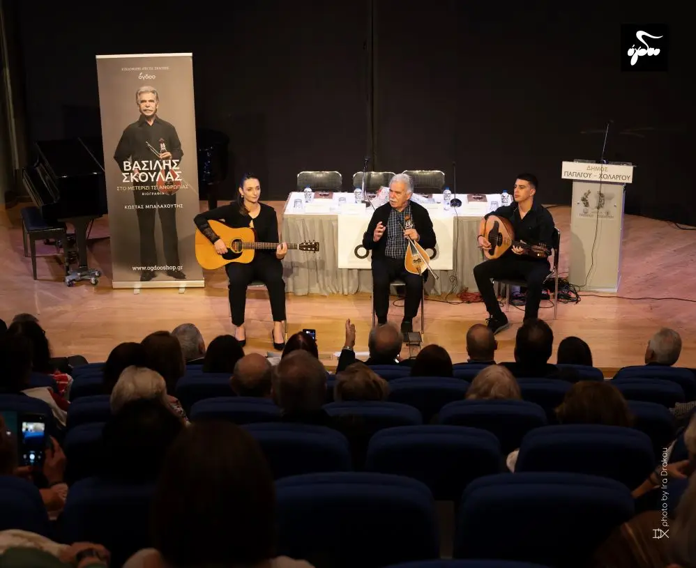 Στην κατάμεστη αίθουσα του φιλόξενου αμφιθεάτρου «Μίκης Θεοδωράκης», στο δημαρχείο Παπάγου- Χολαργού, έλαβε μέρος η πρώτη παρουσίαση της βιογραφίας του Βασίλη Σκουλά με τίτλο «Στο Μετερίζι τσ΄ Ανθρωπιάς», η οποία κυκλοφορεί από τις εκδόσεις Όγδοο.