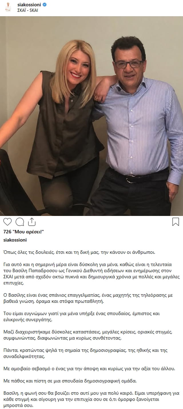 «Όπως όλες τις δουλειές, έτσι και τη δική μας, την κάνουν οι άνθρωποι. Για αυτό και η σημερινή μέρα είναι δύσκολη για μένα, καθώς είναι η τελευταία του Βασίλη Παπαδροσου ως Γενικού Διευθυντή Eιδήσεων και Eνημέρωσης στον ΣΚΑΪ μετά από σχεδόν οκτώ πυκνά και δημιουργικά χρόνια με πολλές και μεγάλες επιτυχίες.