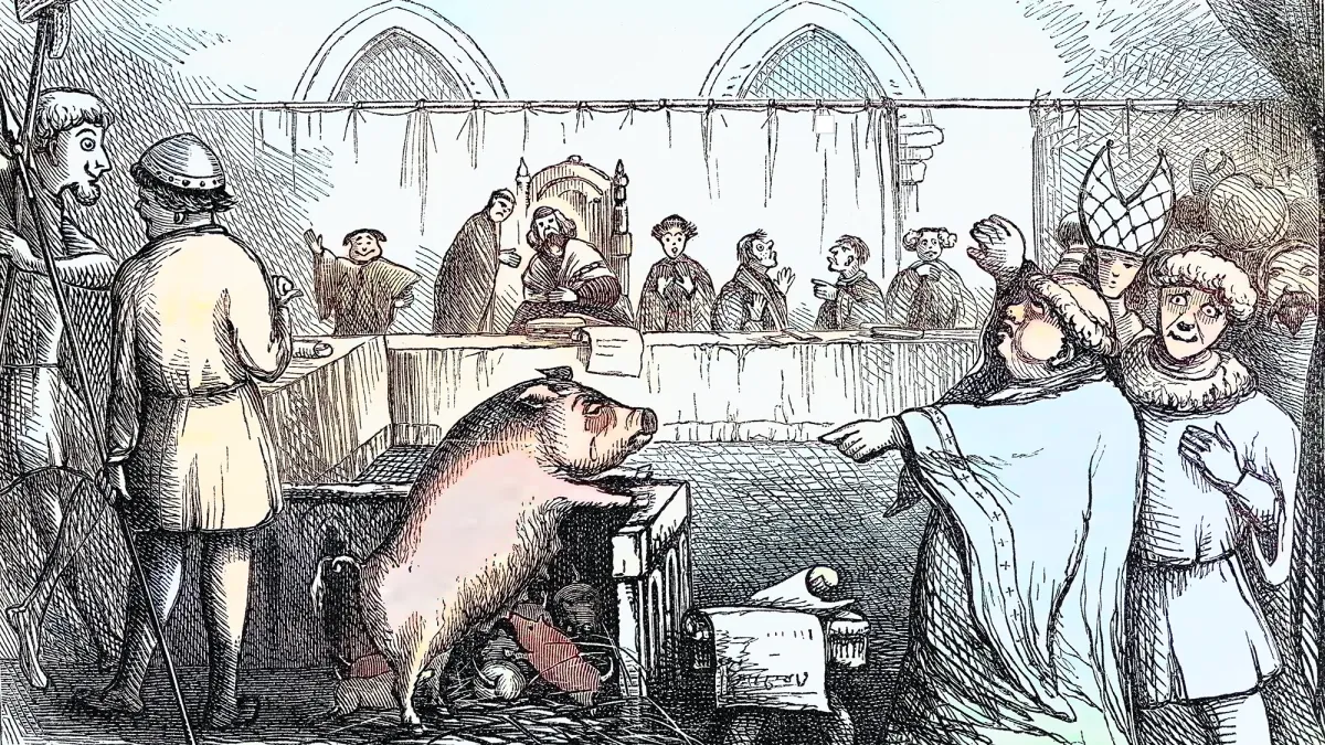 Ωστόσο, η πραγματικότητα μερικές φορές είναι πιο παράξενη από τη φαντασία. Γιατί μερικές φορές ο εγκληματίας που γυρνούσε την πόλη δεν ήταν άνθρωπος. Περιστασιακά, ο κρατούμενος στην άκρη του σχοινιού ήταν ένα γουρούνι, κρεμασμένο ανάποδα μέχρι να πεθάνει. Στη μεσαιωνική Ευρώπη, τα γουρούνια πήγαιναν σε δίκη—και η αγχόνη—αναπάντεχα συχνά.