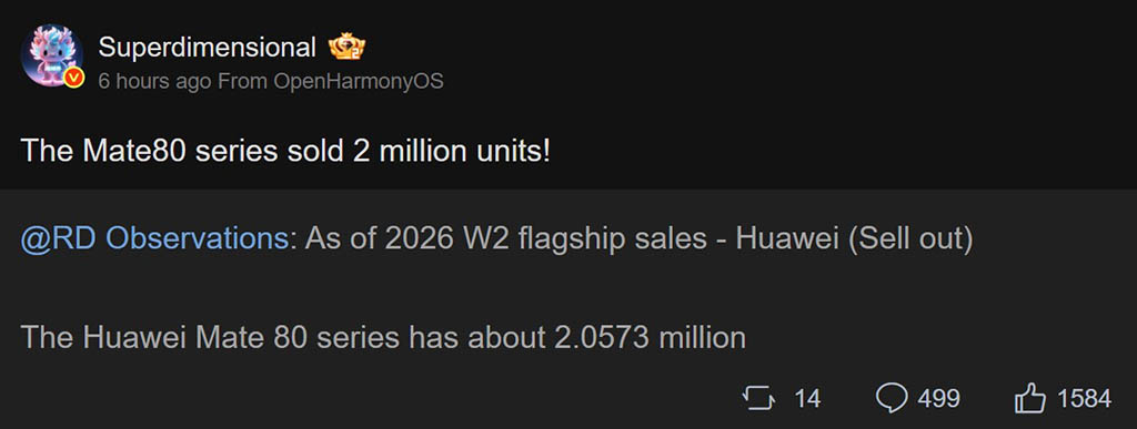 Σύμφωνα με τον tipster, η σειρά Mate 80 έχει πουλήσει περίπου 2,0573 εκατομμύρια μονάδες από τη δεύτερη εβδομάδα του 2026. Έφτασε στο νέο όριο πωλήσεων σε λίγες ημέρες, πυροδοτώντας ένα σημαντικό αριθμό αποστολών (16-20 εκατομμύρια) τους επόμενους μήνες.
