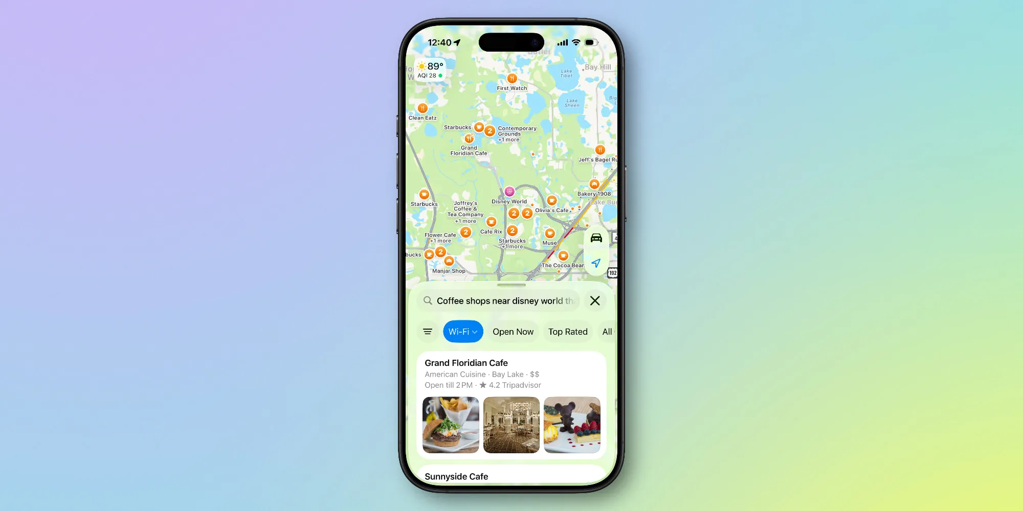 Έτσι, για παράδειγμα, κατά τη διάρκεια της περιόδου beta του iOS 26, πραγματοποίησα την ακόλουθη αναζήτηση στους Χάρτες: «Καφετέριες κοντά στην Disney World που διαθέτουν Wi-Fi».