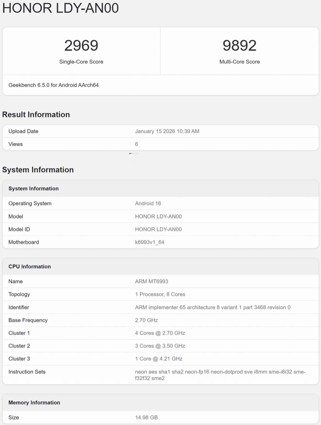 Το Honor Magic 8 Pro Air (LDY-AN00) κερδίζει τις βαθμολογίες του Geekbench, συμπεριλαμβανομένων 2969 πόντων στον μονοπύρηνο και 9892 πόντων στον πολυπύρηνο. Η βελτιστοποίηση του MagicOS 10.0 (Android 16) αναμένεται να αυξήσει αυτές τις βαθμολογίες ακόμη περισσότερο, μαζί με τη βελτίωση της αποτελεσματικότητας.
