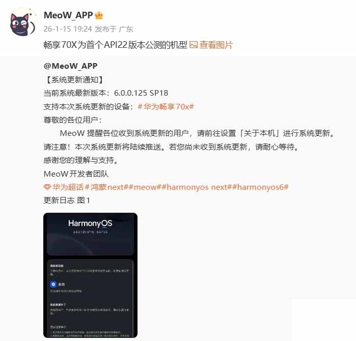 Ένας tipster του Weibo μοιράστηκε ορισμένες λεπτομέρειες σχετικά με αυτό ότι το Enjoy 70X θα είναι το πρώτο μοντέλο που θα δοκιμάσει το HarmonyOS 6 με το API 22 μέσω δημόσιας δοκιμής beta. Ο tipster συνόδευσε αυτές τις πληροφορίες με ένα στιγμιότυπο οθόνης, που δείχνει την έκδοση 6.20.0.125.