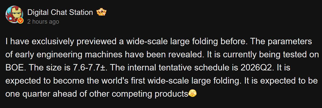 Ο tipster αποκάλυψε τις παραμέτρους της πτυσσόμενης μηχανής πρώιμης μηχανικής. Αυτή τη στιγμή δοκιμάζει ένα πάνελ οθόνης που παρέχεται από την BOE με μέγεθος 7,6 έως 7,7 ίντσες.