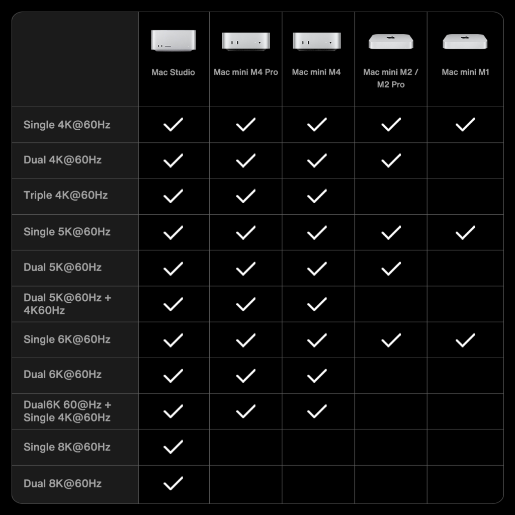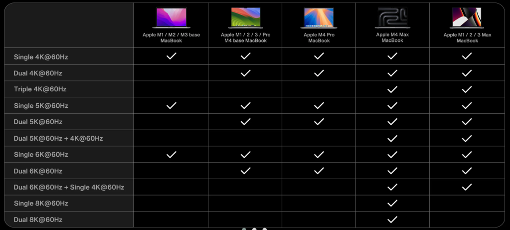 Σε αντίθεση με πολλές καθολικές βάσεις, το FusionDock Max 2 έχει σχεδιαστεί ειδικά για Apple Silicon MacBooks. Δεν είναι συμβατό με υπολογιστές ή Mac που βασίζονται σε Intel και αυτό είναι σκόπιμα — εστιάζοντας στην αρχιτεκτονική της Apple, τη βελτιστοποιημένη απόδοση, τη συμβατότητα και την παροχή ισχύος για τα τσιπ της σειράς M της iVANKY. Το αποτέλεσμα είναι μια εμπειρία plug-and-play που ενσωματώνεται άψογα με το macOS, υποστηρίζοντας εγγενή έξοδο τριπλής οθόνης χωρίς πρόσθετα προγράμματα οδήγησης ή λύσεις. Ακολουθούν μερικά γραφικά που δείχνουν τη συμβατότητα και τι μπορεί να κάνει κάθε γενιά Mac μαζί με τη νέα βάση σύνδεσης Max 2.