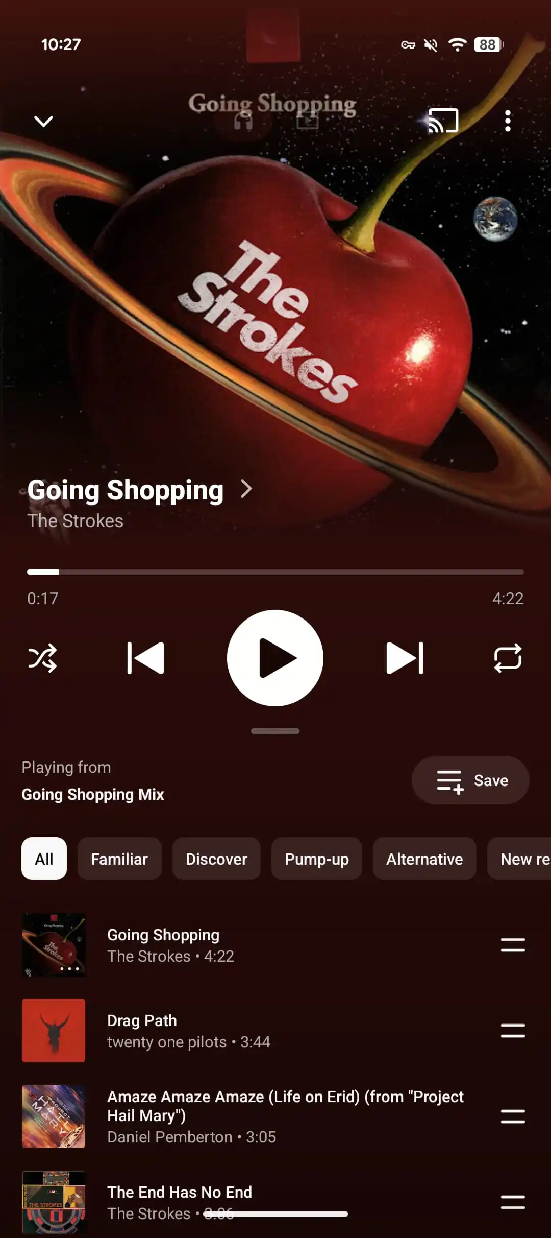 Ο χρήστης μπορεί να σύρει προς τα πάνω το player, ακόμα και από την κορυφή, ώστε να εμφανιστεί η διπλή προβολή με το εξώφυλλο και τα controls στο επάνω μισό και τα επόμενα τραγούδια στο κάτω.