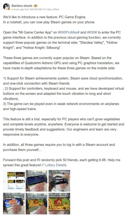 Σύμφωνα με την τελευταία δήλωση του Product Manager της REDMISun Cun, αποκαλύφθηκε ότι τα νέα smartphones REDMI K90 και REDMI K90 Pro Max είναι εξοπλισμένα με μηχανή παιχνιδιού που υποστηρίζει το Ατμός σε τηλέφωνα, επιτρέποντας στους χρήστες να τρέχουν παιχνίδια Steam στα smartphone τους. Η λίστα των παιχνιδιών περιλαμβάνει Hollow Knight, Hollow Knight: Silksong και Κοιλάδα Stardewσύμφωνα με την επίσημη ανακοίνωση του λογαριασμού Weibo της Sun Cun.