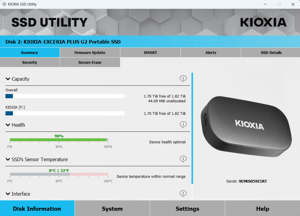 Επίσης να αναφέρουμε οτι είναι μια long-term δοκιμή καθώς εδώ και περίπου 4 μήνες χρησιμοποιούμε το δίσκο αυτό για αποθήκευση μεγάλων αρχείων video και editing κατευθείαν από το δίσκο, έχει ανταποκριθεί εξαιρετικά, δεν έχει ζεσταθεί ποτέ του και είναι πολύ βολικός στη μεταφορά. Μάλιστα, χάρη στο συνοδευτικό SSD Utility software, μπορείτε να ελέγχετε την υγεία του και τη λειτουργία του ανά πάσα στιγμή (Windows 10, 11). Όπως θα δείτε και στις παρακάτω φωτογραφίες, μετά από 150 ώρες χρήσης και πολλά TB εγγραφών στο δίσκο, το health του είναι στο 98%, έπειτα από μήνες στα χέρια μας. Το software σας επιτρέπει επίσης να βλέπετε τη θερμοκρασία του, να ορίσετε password για την πρόσβαση στα δεδομένα και να κάνετε secure erase, αν και όταν χρειαστεί.
