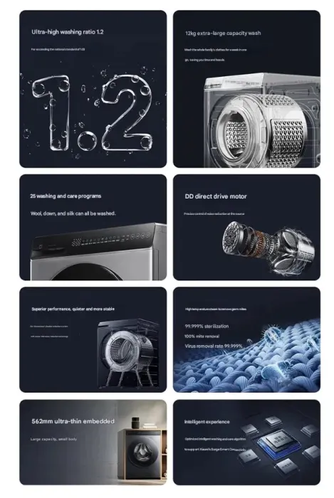 Το νέο πλυντήριο ρούχων Xiaomi Mijia 12 κιλών έχει αναλογία πλύσης 1,2, πολύ υψηλότερο σε σύγκριση με το εθνικό πρότυπο που έχει ορίσει η Κίνα στο 1,03. Αυτό επιτεύχθηκε με την υιοθέτηση ενός πρόσφατα σχεδιασμένου τρισδιάστατου συστήματος ροής νερού που μπορεί να εξισορροπήσει την πίεση του νερού στις επιφάνειες του υφάσματος. Το μοντέλο χρησιμοποιεί επίσης έξυπνες μεθόδους ανίχνευσης φορτίου για να προσαρμόζει την ταχύτητα πλύσης, τη στάθμη του νερού και τη μηχανική κίνηση ανάλογα με το βάρος και το υλικό των ρούχων.