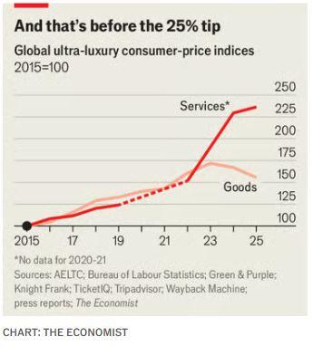 Ο Economist συνέθεσε έναν δείκτη υπηρεσιών υπερπολυτελείας, που περιλαμβάνει τα πάντα: από ένα εισιτήριο για το Super Bowl μέχρι το φαγητό σε ένα εστιατόριο με τρία αστέρια Michelin.